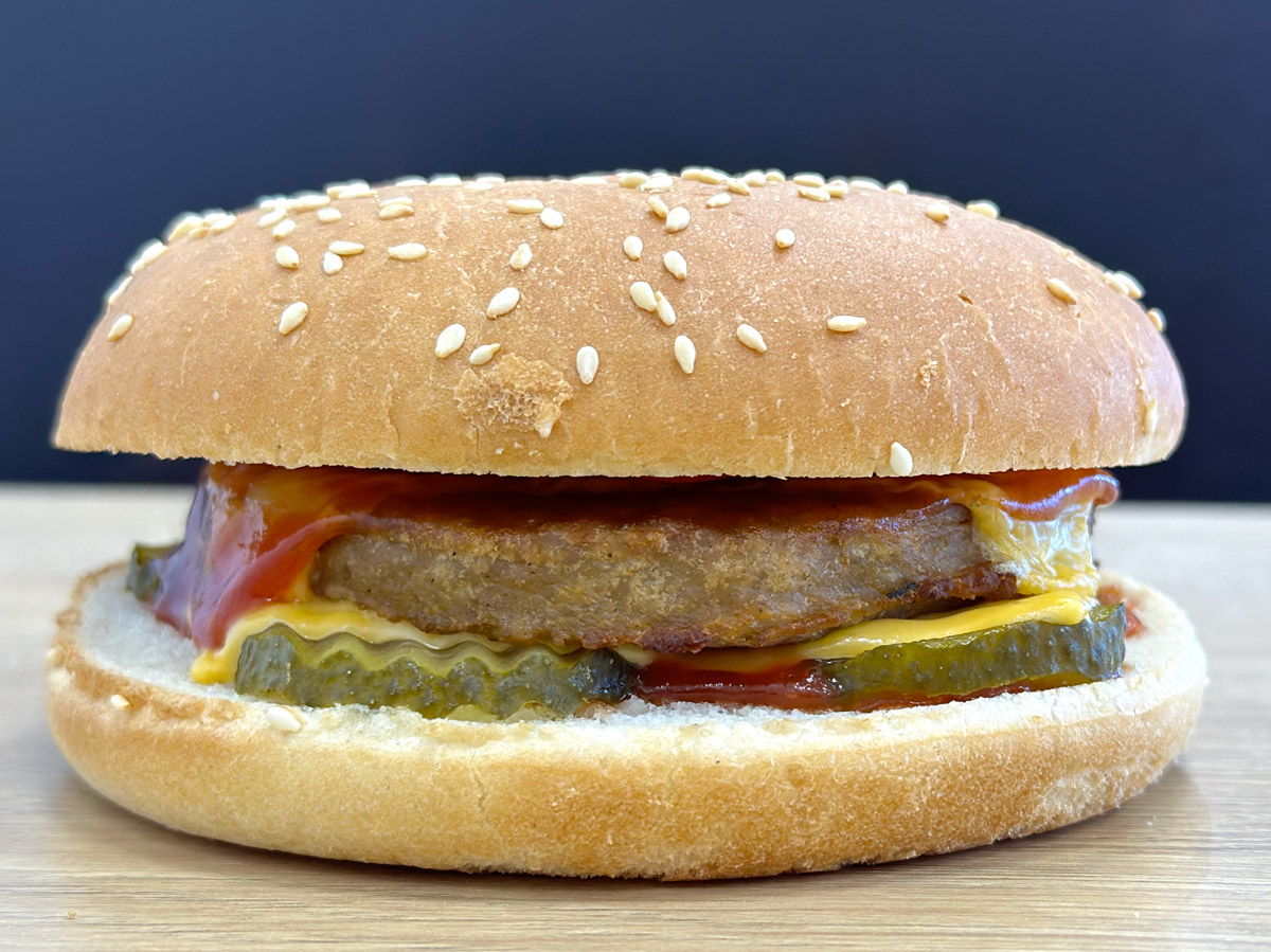 Brioche burgerikukkel, burgeripihv, cheddari juust, marineeritud kurk, ketšup