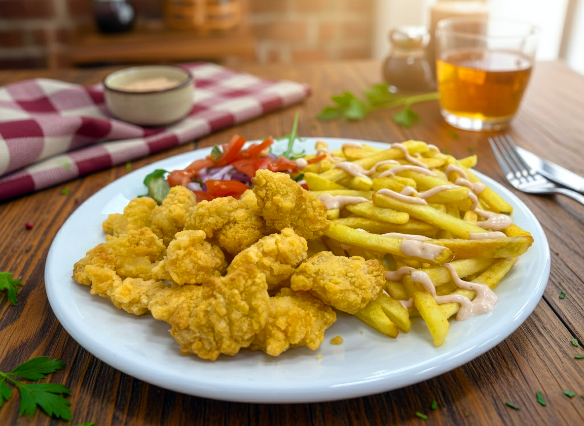 Kanafilee nagitsad, krõbedad ahju friikartulid, värske salat ja ketšupi majoneesi kaste