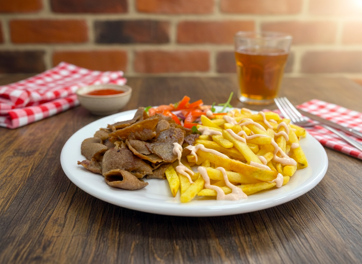 Kebab, krõbedad ahju friikartulid, värske salat ja ketšupi majoneesi kaste